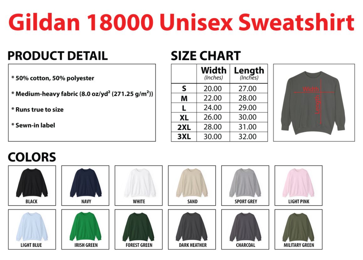 - Size available: S, M, L, XL, 2XL, 3XL, 4XL, 5XL Unisex Sweatshirt (Gildan 18000) 50% cotton, 50% polyester - Medium-heavy fabric (8.0 oz/yd² (271.25 g/m²)) -