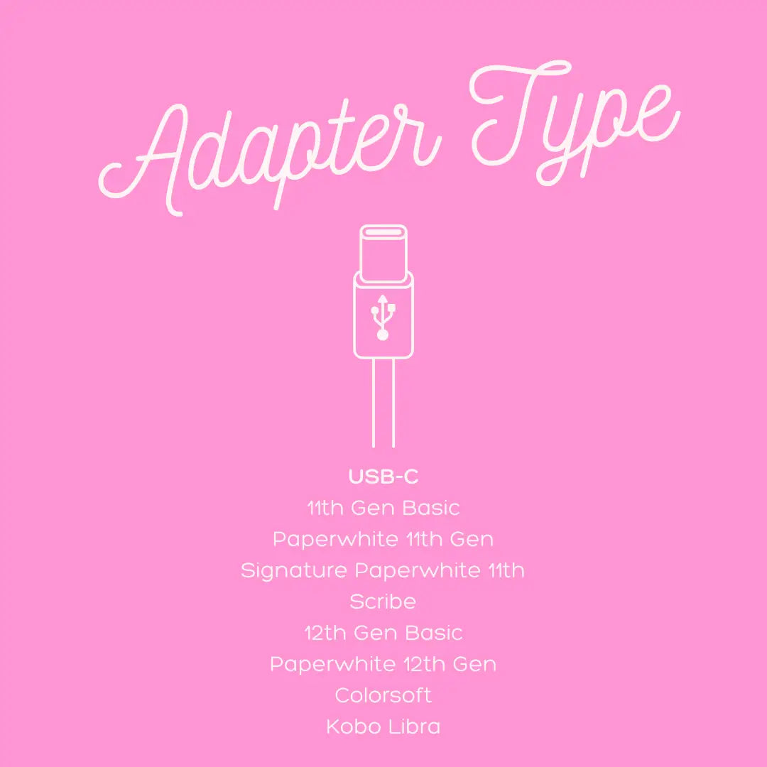 USB-C adapter. Works with most Kindles (not Oasis or older than 10th Gen) and Kobo Libra Colour.